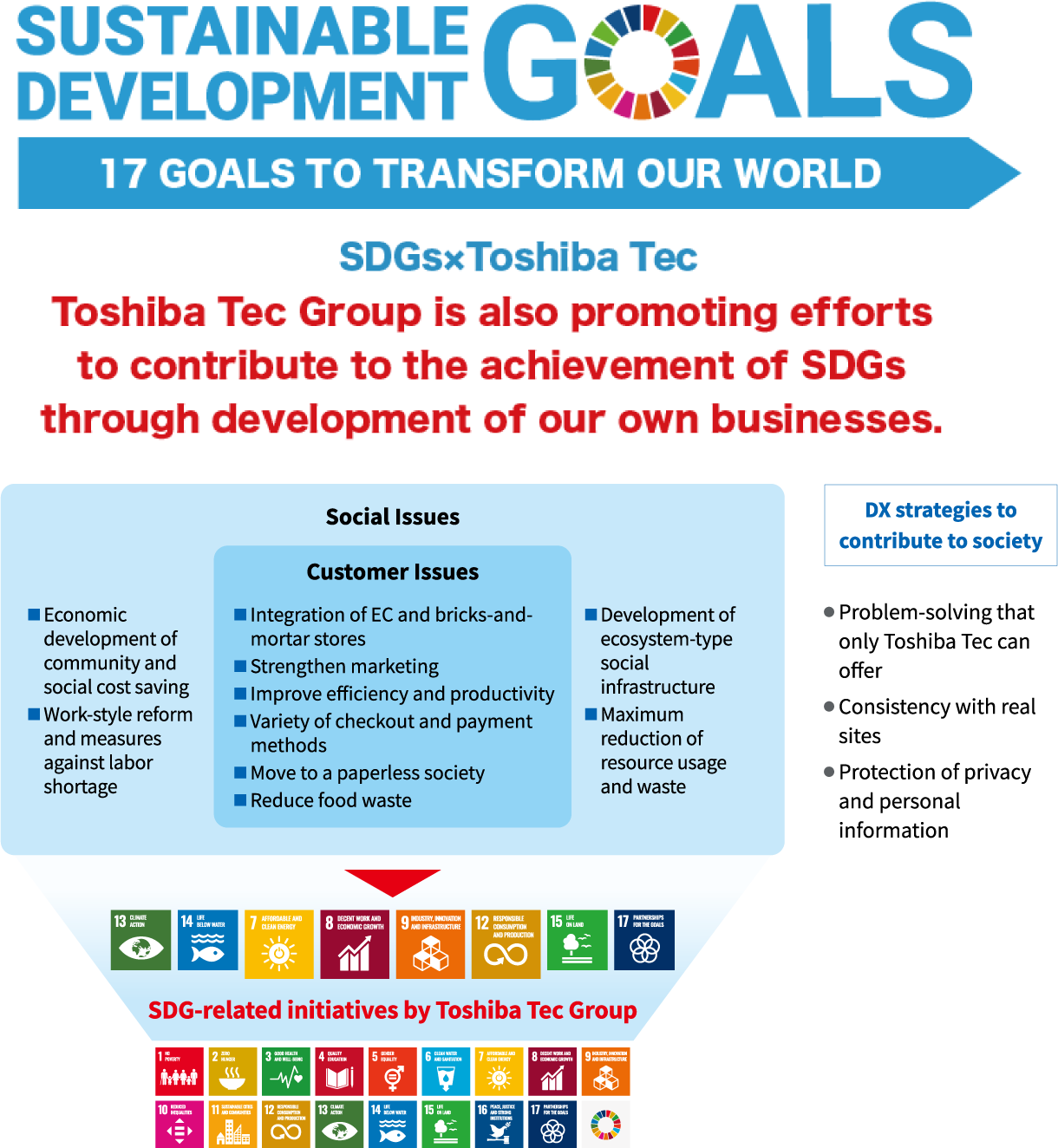As a solutions partner that contributes to the resolution of issues in stores, offices, logistics, and manufacturing, Toshiba Tec will work with its customers to promote initiatives aimed at achieving the SDGs.