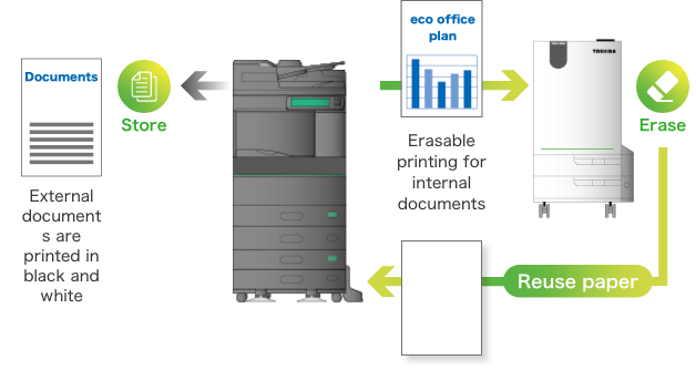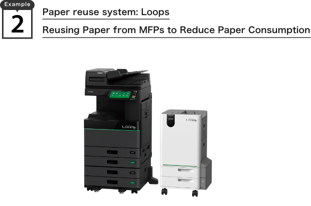 Loops is a system which is able to print and erase on standard copy paper, allowing it to be reused. A single machine can be set such that it provides traditional monochrome printing for documents to be presented to customers or to be saved, as well as erasable printing for receiving faxes or internal documents such as check sheets, so without any change to existing workstyles, the amount of paper used for printing can be reduced. It is also capable of digitizing documents as it erases them, helping prevent papers from piling up, and realizing an ideal cycle of paper documents and electronic data.